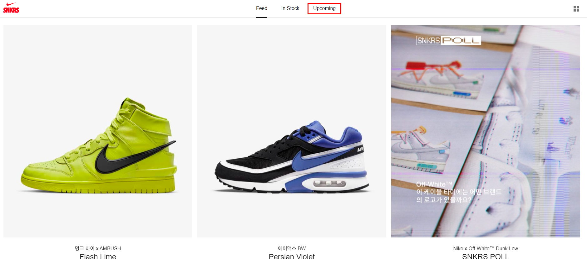 나이키 드로우 참여를 위해 'Upcoming' 카테고리를 클릭합니다.