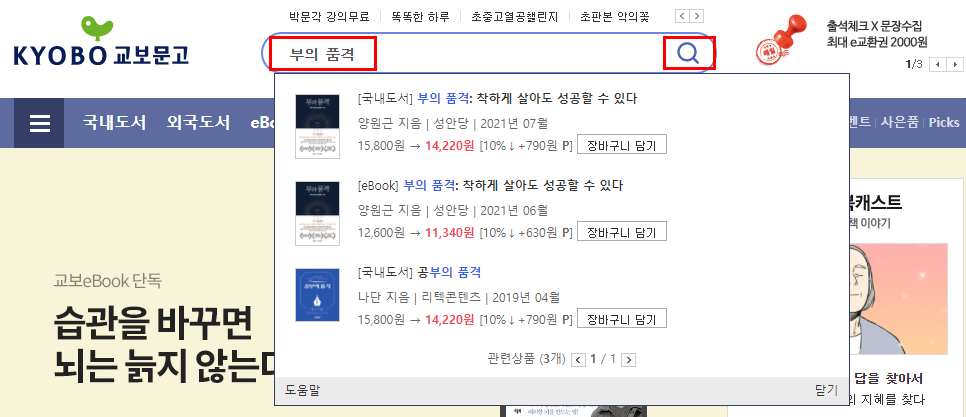 검색 후 상단 이미지처럼 교보문고 홈페이지 주소가 나와있으며,