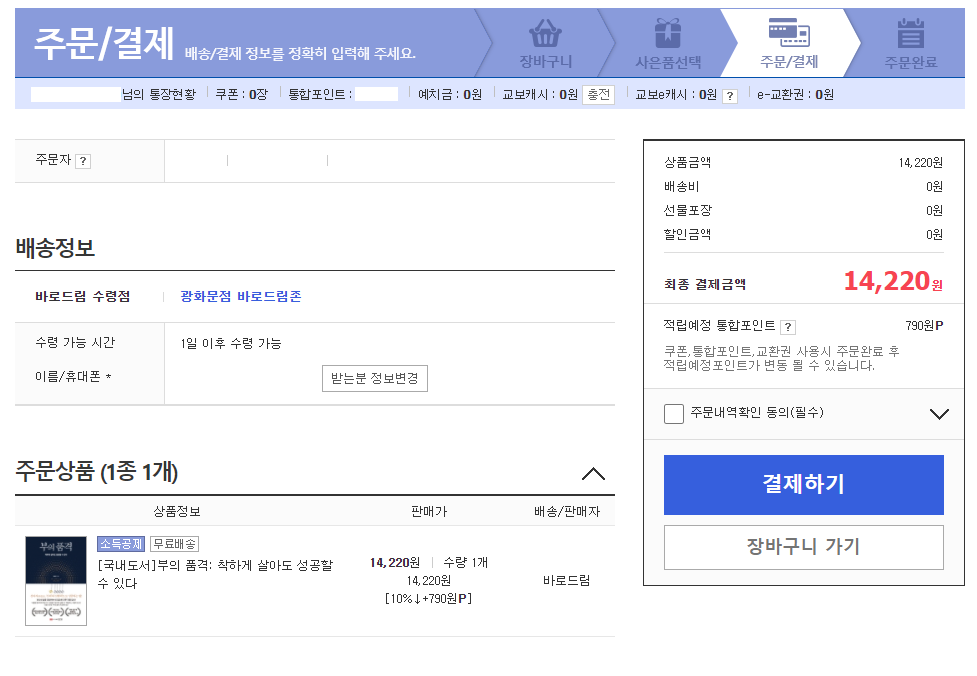 원하는 책이 맞는지 최종 확인 후 결제하기 버튼을 눌러서 최종결제를 진행하시면 됩니다.