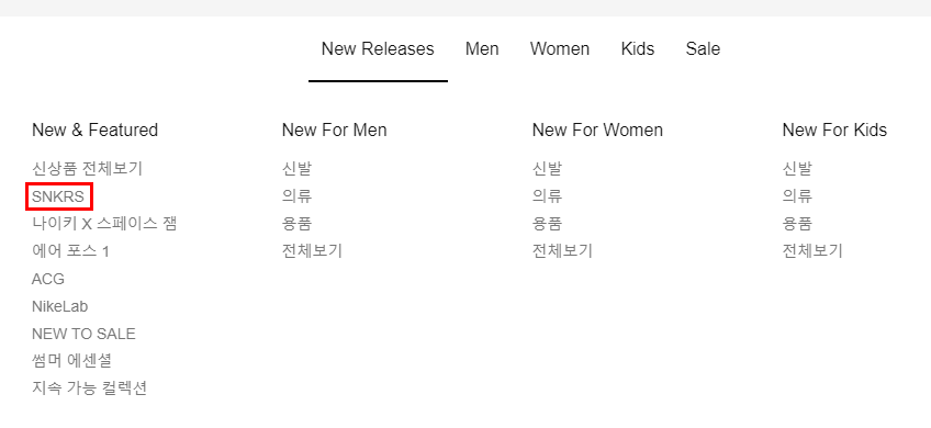 나이키 홈페이지에 로그인 후 'New Releases'에 'SNKRS'를 클릭합니다.
