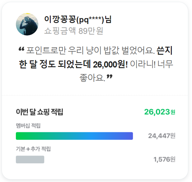 쇼핑을 자주 하시는 분들에게는 후기작성만으로 월 구독료 이상을 포인트로 얻을 수 있습니다.