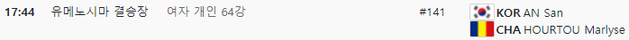 안산 선수는 오후 17시 44분에 차드 선수와 여자 양궁 개인전 64강 경기를 합니다.