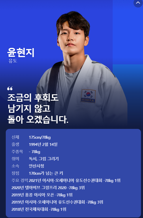 여자 유도 -78kg급에는 윤현지 선수가 참가합니다.