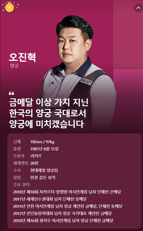 양궁 남자 개인전에는 오진혁 선수가 참가합니다.