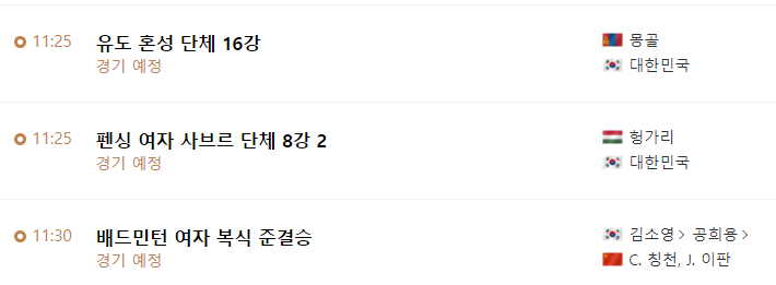 오전 11시 25분에 펜싱 여자 사브르 단체전 8강전 경기를 합니다.