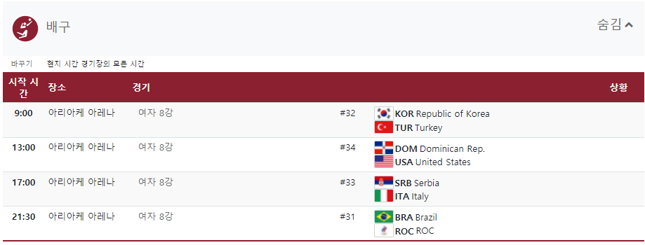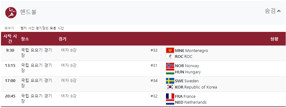 우리나라 선수들이 참가한 종목은 여자 핸드볼 8강전, 남자 탁구 4강전, 여자배구 8강, 남자 야구 준결승 입니다.