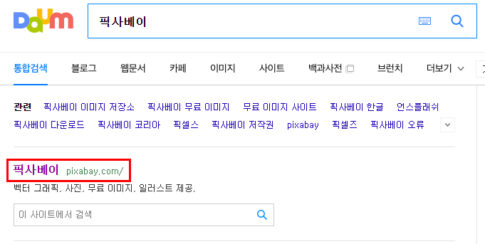 포털사이트 검색창에 '픽사베이' 또는 'Pixabay' 를 검색합니다.