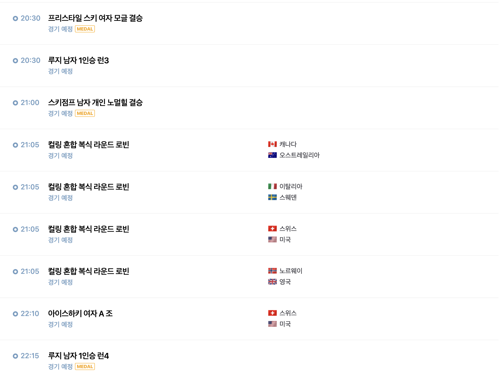 주요 경기는 컬링 혼합 복식, 스노보드 슬로프스타일, 크로스컨트리 남자 스키애슬론 피겨 스케이팅 단체전, 스피드 스케이팅 5000m, 루지 결승 등 있습니다.