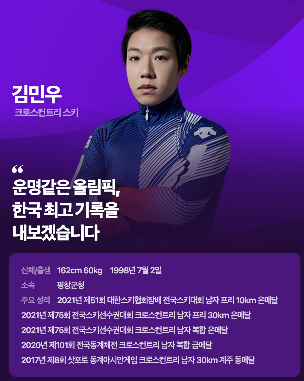 김민우 선수는 삿포로 동계 아시안게임에서 동메달리스트이며, 작년 전국대회에서 은메달을 획득했습니다.