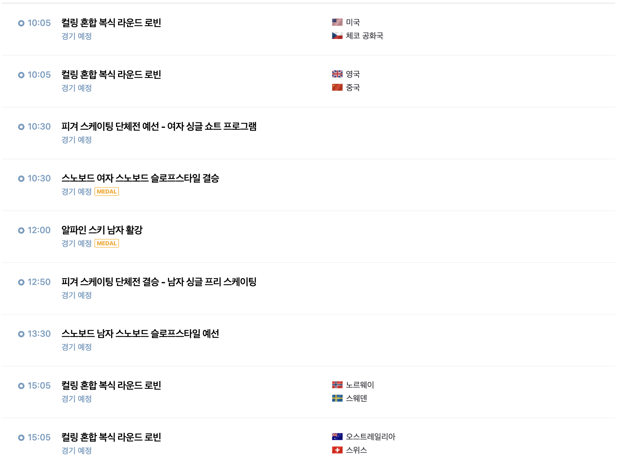 주요 경기는 컬링 혼합 복식, 스노보드 슬로프스타일, 크로스컨트리 남자 스키애슬론 피겨 스케이팅 단체전, 스피드 스케이팅 5000m, 루지 결승 등 있습니다.