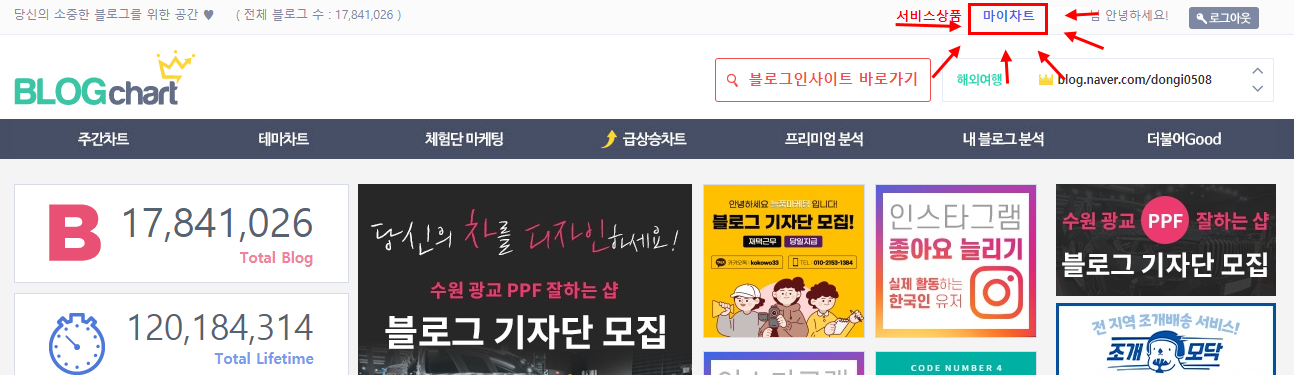 가입한 블로그차트에 로그인 한 뒤, 메인 홈페이지 상단에 마이차트를 클릭해주세요.