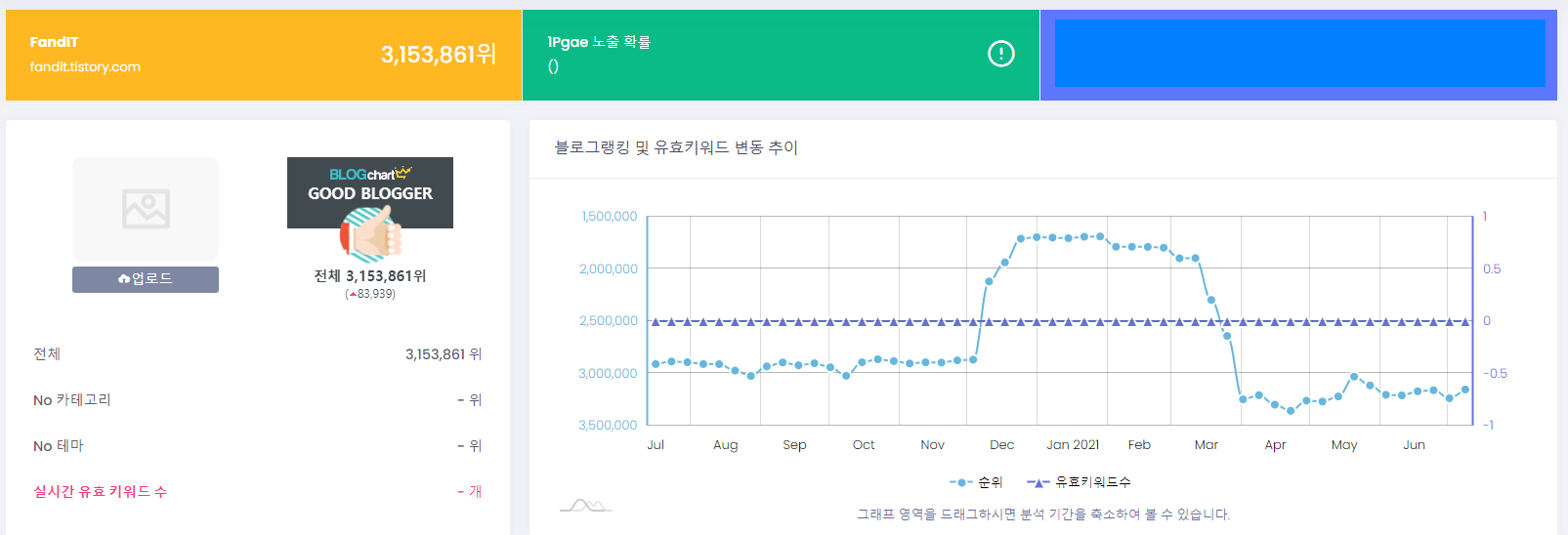그럼 본인이 등록한 블로그에 대한 순위와 정보 등 대략적인 내용이 노출됩니다.