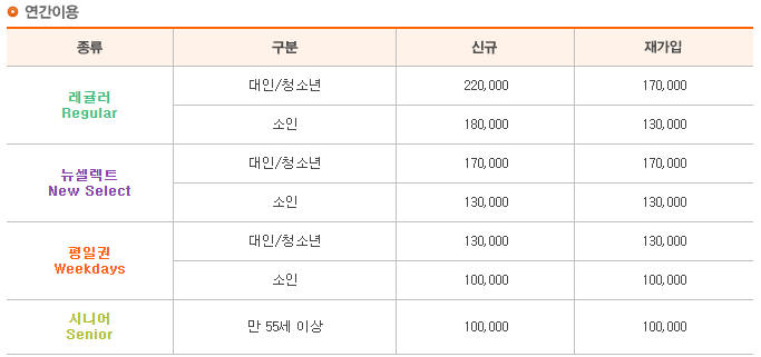레귤러, 뉴셀렉트, 평일권, 시니어 등 총 4가지의 연간 이용권을 판매합니다.