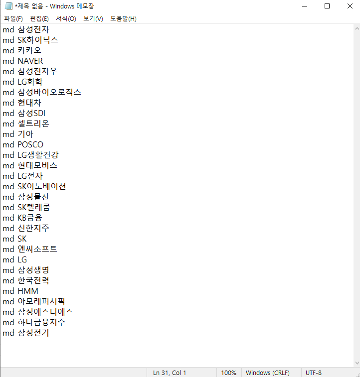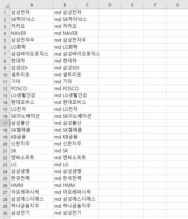 B1셀을 복사하여 B2 ~ B30 셀까지 붙여넣기를 하시면 회사명 앞에 'md ' 가 생깁니다.