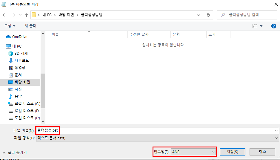 그리고 메모장 파일이름을 '폴더생성.bat' 변경합니다.