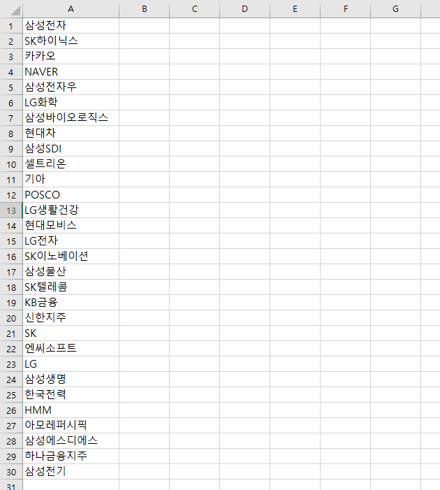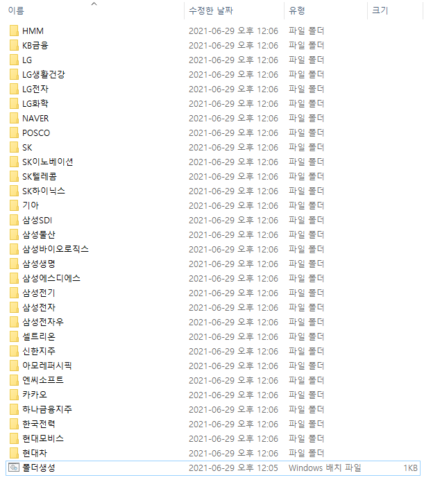 예시로 요즘 화제인 코스피 시가총액 TOP30 회사명으로 폴더를 생성해보겠습니다.