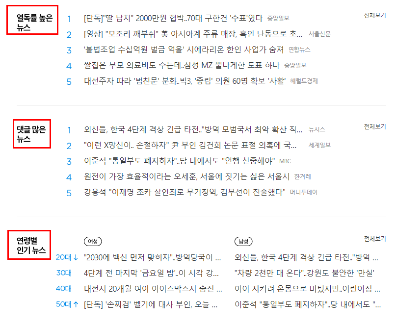 하단부분에 '열독률 높은 뉴스' , '댓글 많은 뉴스' , '연령별 인기 뉴스' 등 깔끔하게 정리되었습니다.