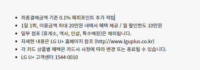 - LGU+ 멤버십 VIP등급 미만은 구매금액 1,000원당 50원 할인혜택