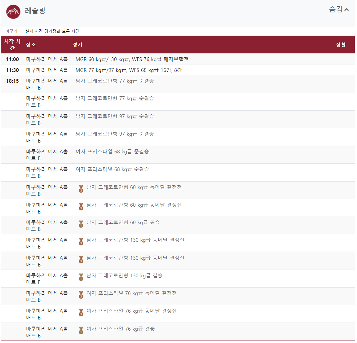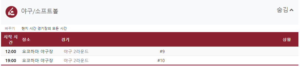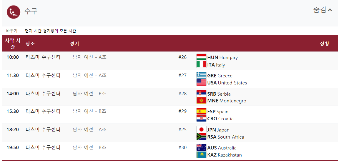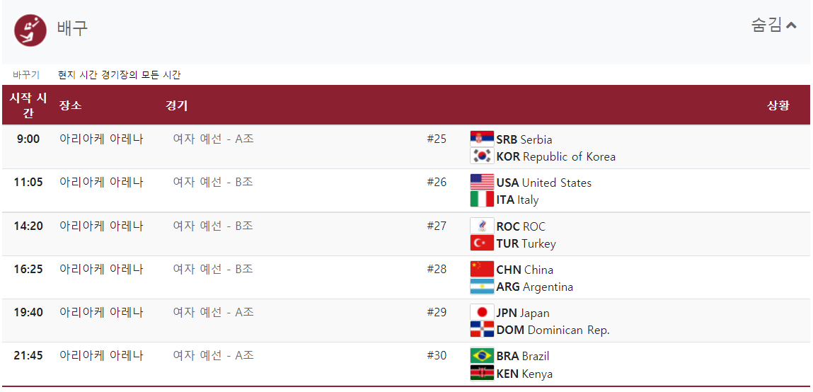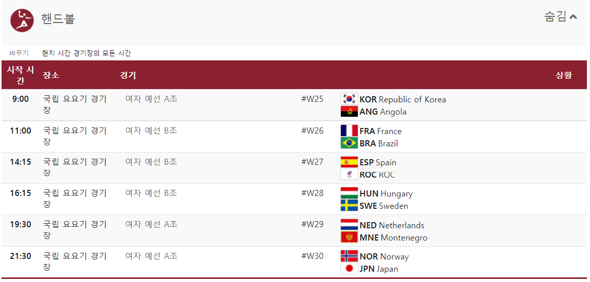 대한민국 선수들의 경기뿐만 아니라 모든 경기 일정입니다.
