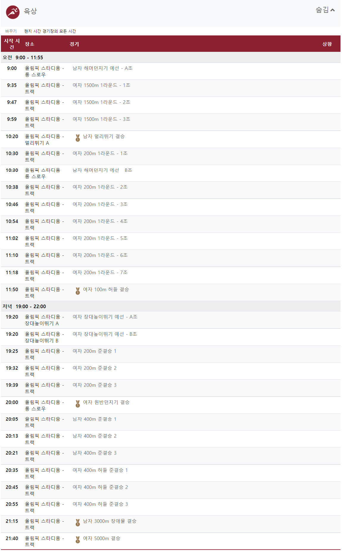 여자 100m 허들 / 남자 멀리뛰기 / 남자 3000m 장애물 / 여자 5000m 등 꼭 시청해야 할 육상종목들이 많이 있습니다.