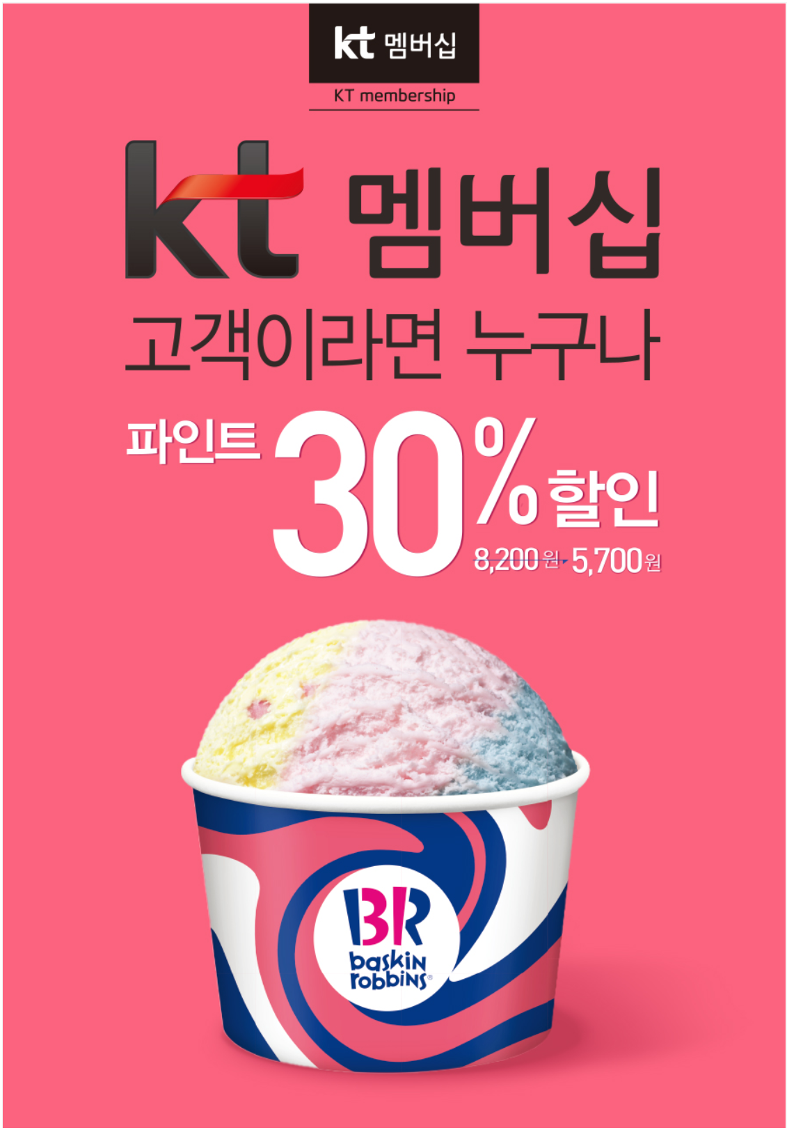 KT 멤버십 회원은 배스킨라빈스 파인트 아이스크림을 30% 가격할인 받을 수 있습니다.