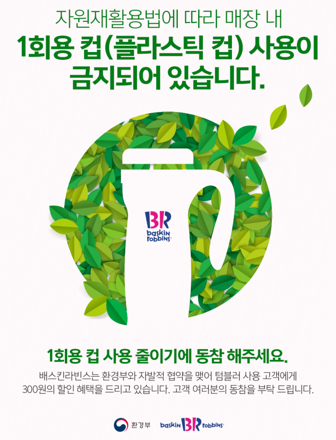 배스킨라빈스에서 음료를 구매 시 개인 텀블러를 사용하면 할인 받을 수 있습니다.