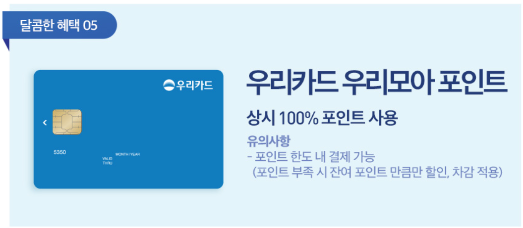 우리카드 우리모아 포인트 보유 시 최대 100% 사용하여 할인 가능합니다.