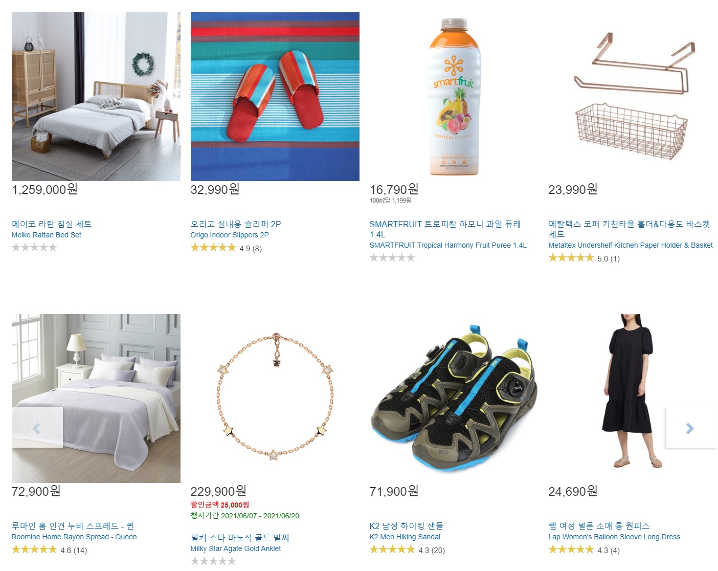 커클랜드 화장지, 일레트로룩스 청소기, 푸마 반바지, 올젠 재킷, 이탈리안홈 소파, 크록스 샌달, 아이리스 마스크, 테팔 프라이펜