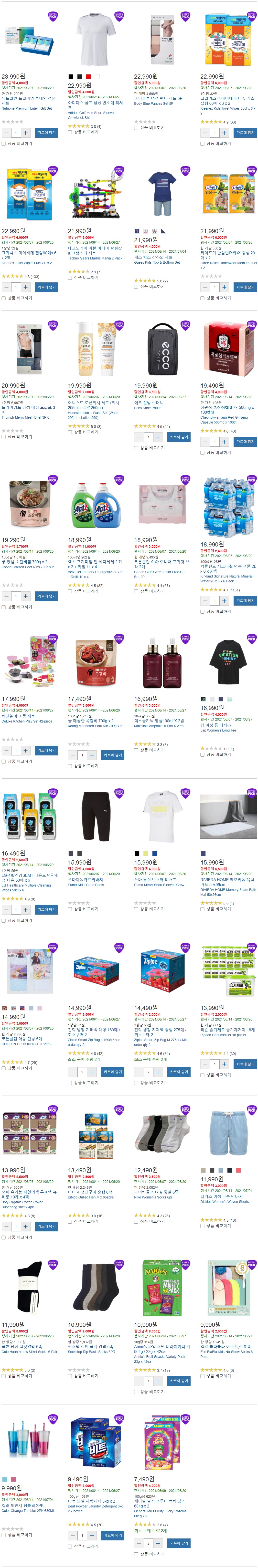 삼성 벽걸이 에어컨, LG 휘센 벽걸이 에어컨, 틸만 하이라이트, 세이코 시계, 휘슬러 압력솥, 쿠첸 밥솥, 덴비 식기세트, 레고, 컬럼비아 바지, 크리넥스 키친타월, 버켄스탁, 종근당건강 유산균, 크리넥스 마이비데, 커클랜드 생수, 푸마 티셔츠, 비비고 생선구이