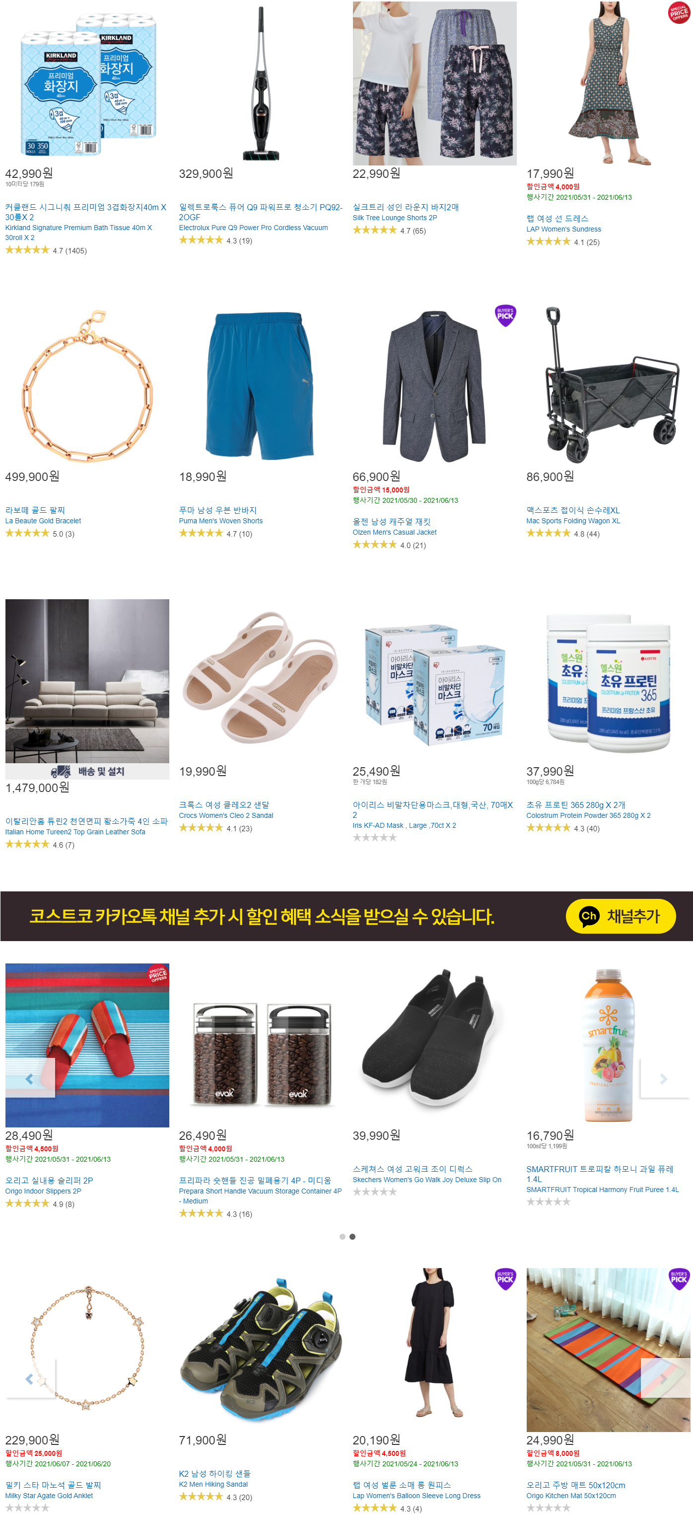 커클랜드 시그니춰 화장지, 일렉트로룩스 청소기, 라보떼 골드 팔찌, 푸마 반바지, K2 하이킹 샌들 등