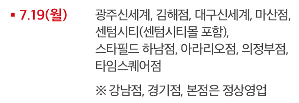 대부분의 신세계백화점 휴무일은 7월 19일날 진행합니다.