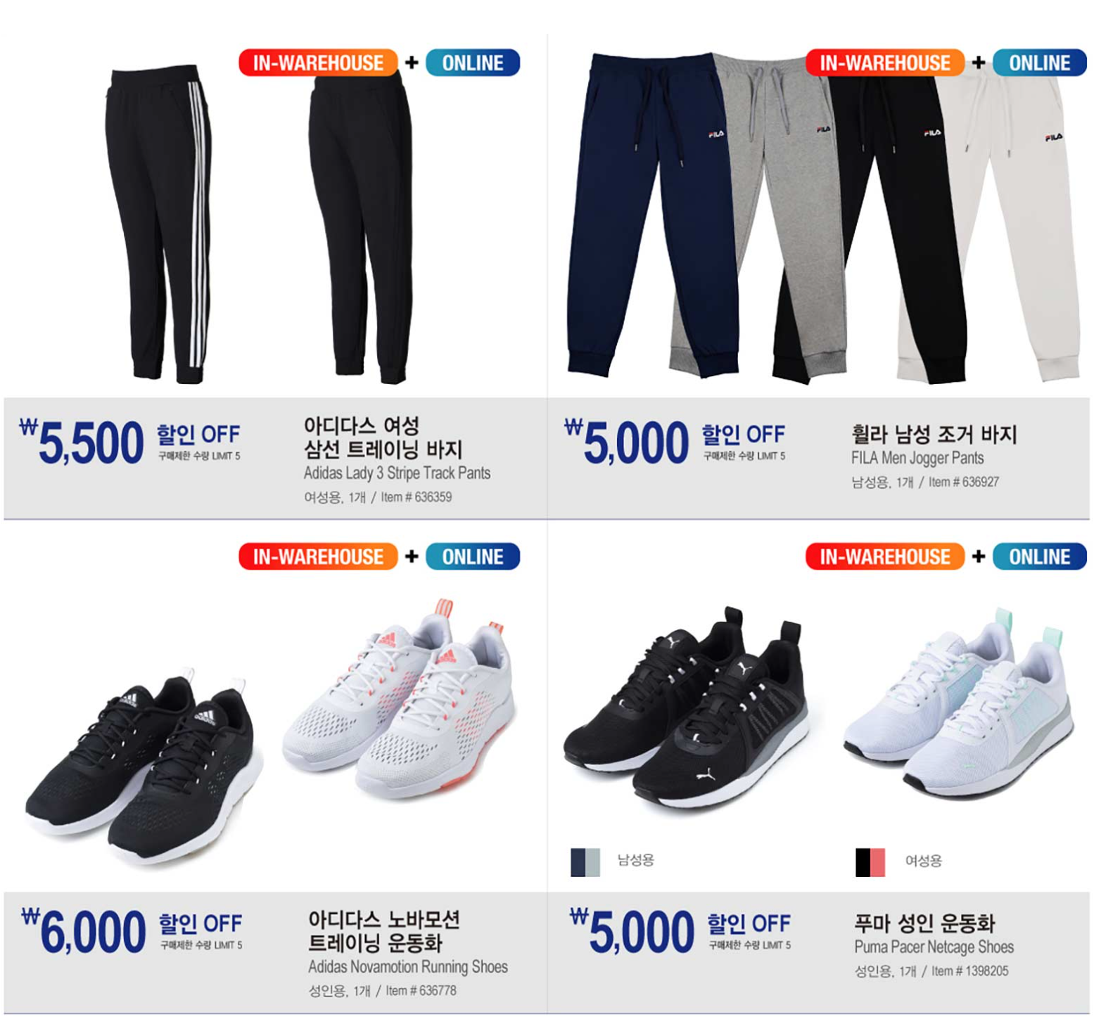 신발부터 바지, 요가매트, 운동보조제 등 다양한 상품들이 할인중입니다.