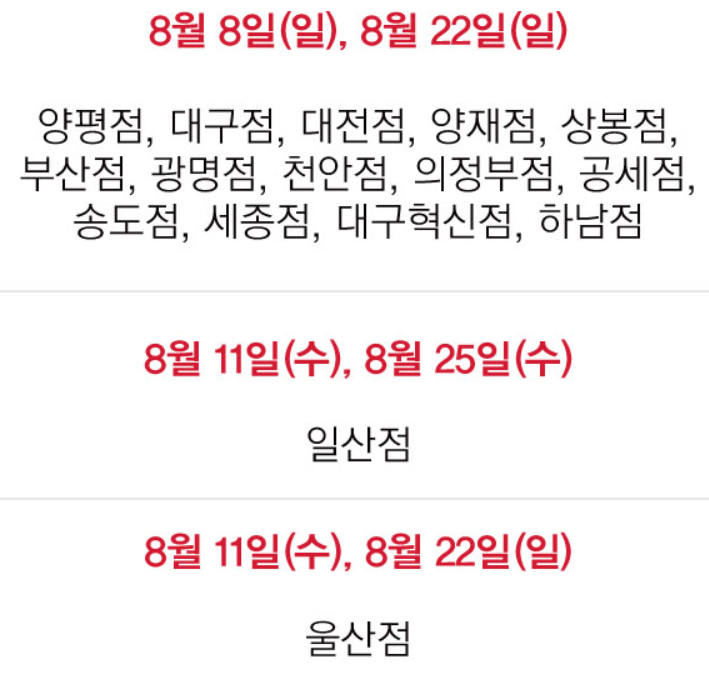 - 8월 8일(일요일) / 8월 22일(일요일) 휴무지점 -