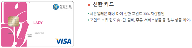 세븐일레븐 결제 시 마이 신한 포인트 30% 차감 할인 됩니다.