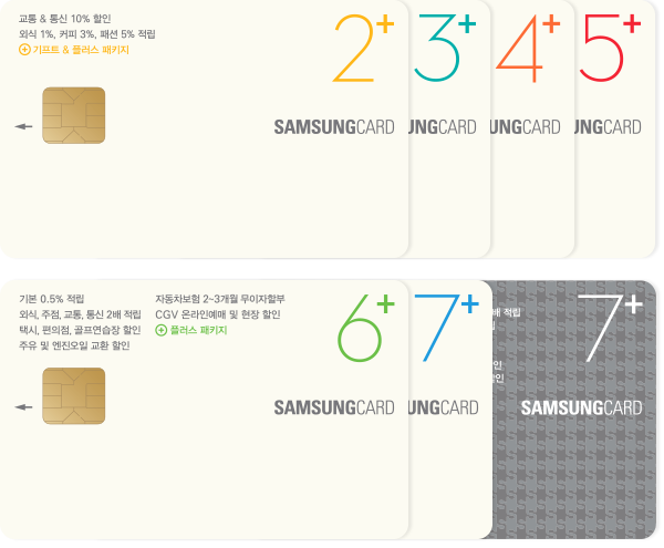 단, 삼성카드 SFC 2+, 삼성카드 SFC 3+, 삼성카드 BIZ 3+, 삼성카드 SFC 4+, 삼성카드 SFC 5+ 는 직전 3개월 평균 일시불 및 할부 이용금액 20만원 이상 시 제공