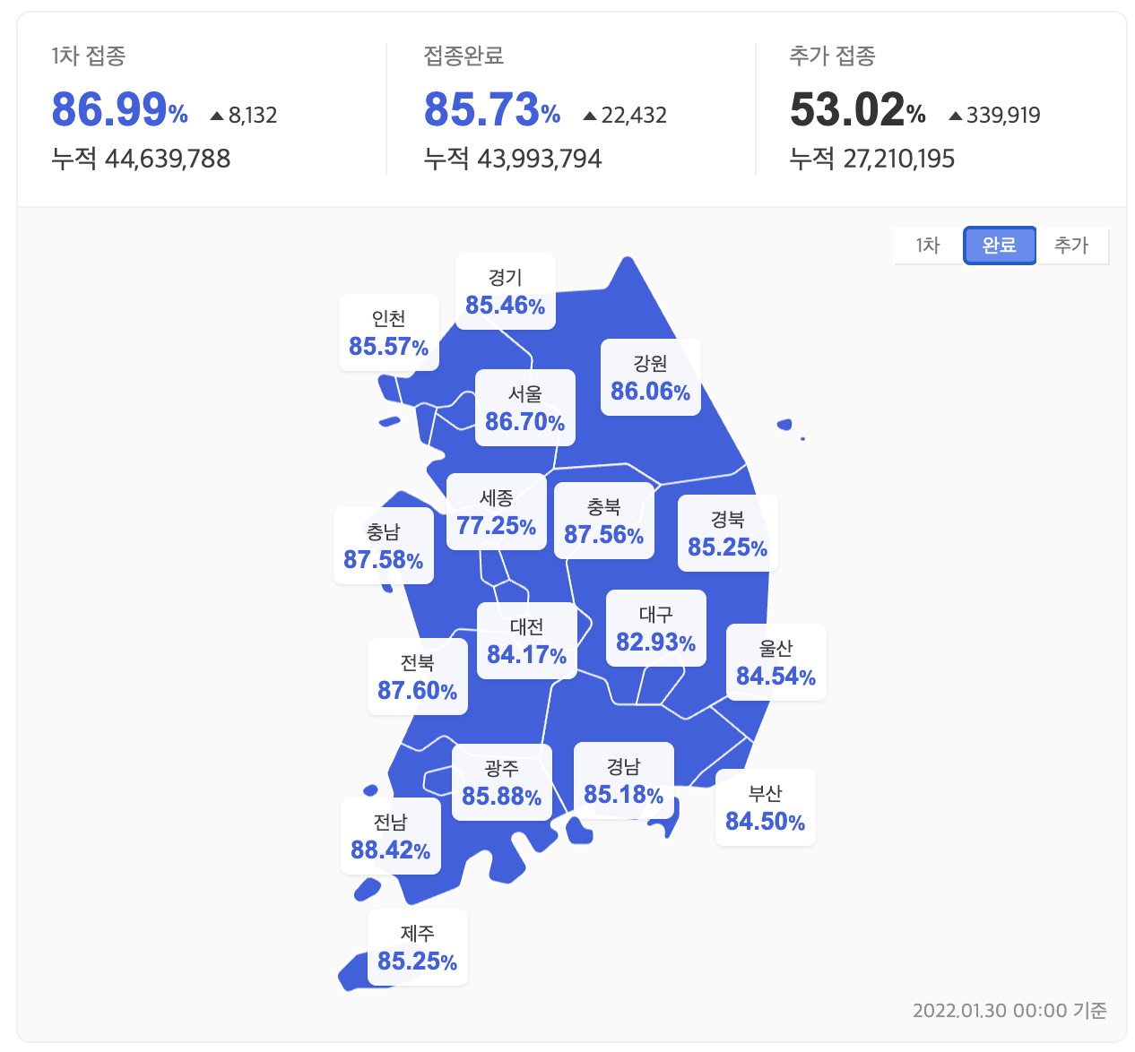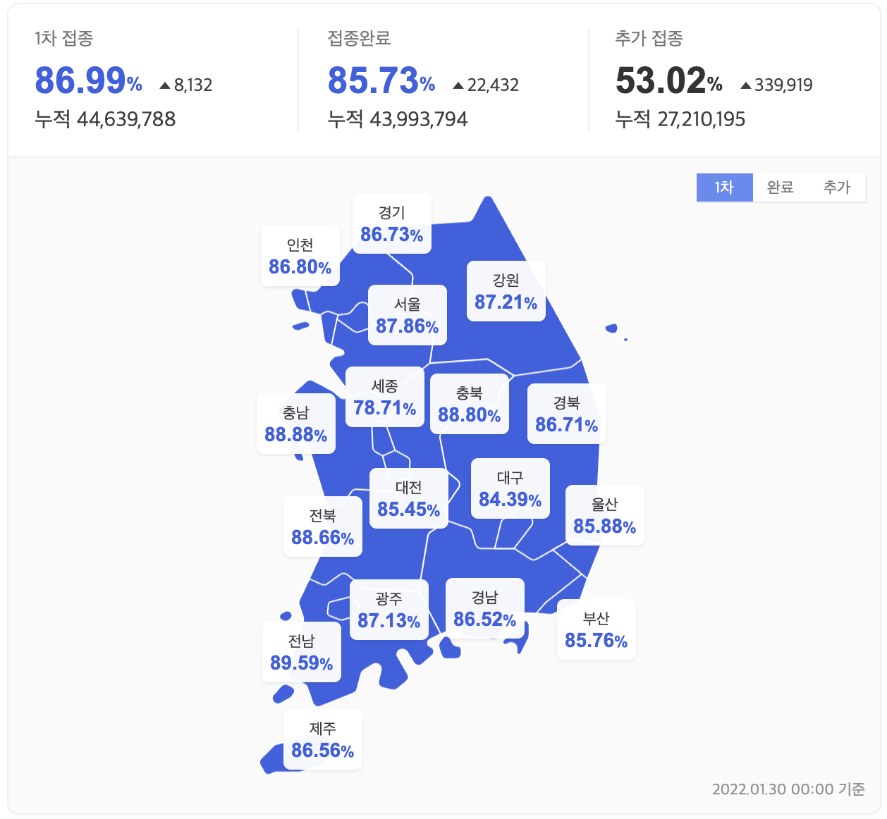 - 2022년 1월 30일 백신 2차접종 현황 -