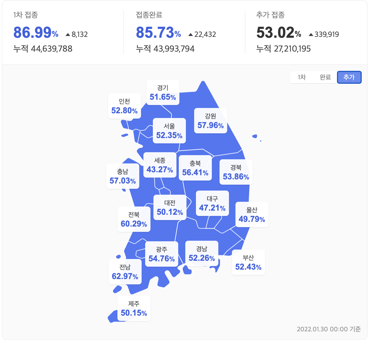 - 2022년 1월 30일 백신 부스터샷(추가접종) 현황 -