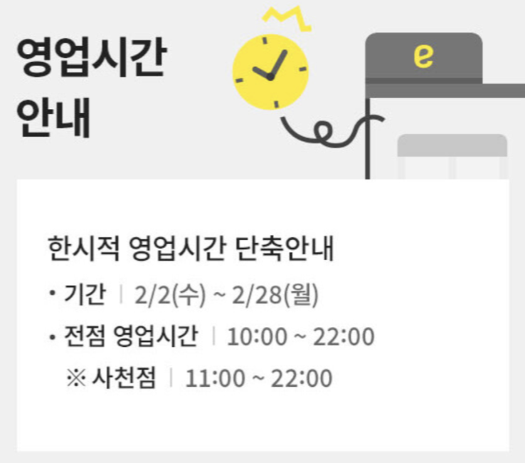 기존에는 23:00까지 영업하던 이마트가 이번 2월달에만 영업시간을 단축합니다.