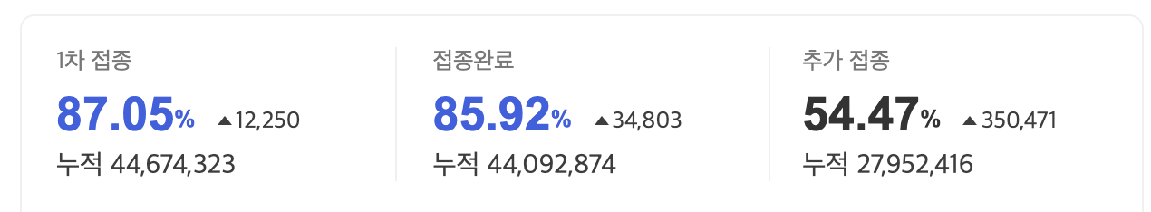 1차 및 2차 백신접종자는 약 90%에 가까운 수치이며, 부스터샷 접종률은 50%대로 미미합니다.
