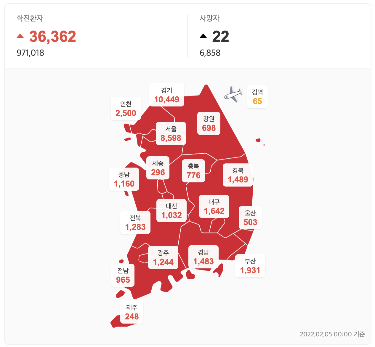 2022년 2월 5일 대한민국 코로나 확진 동향에 대해서 알아보았습니다.
