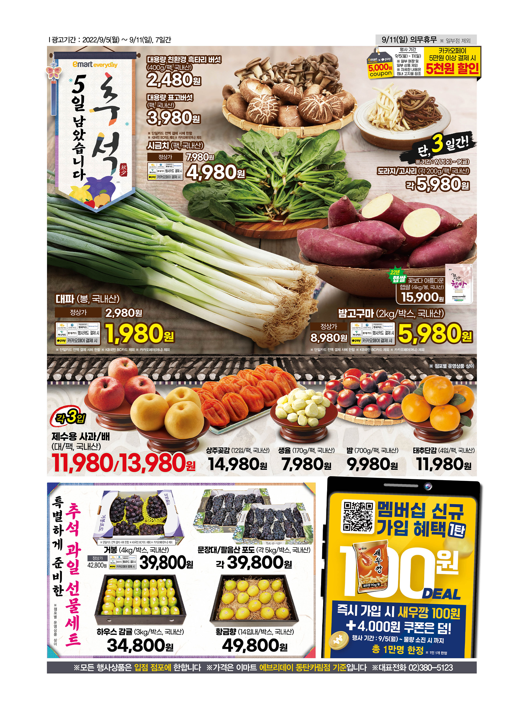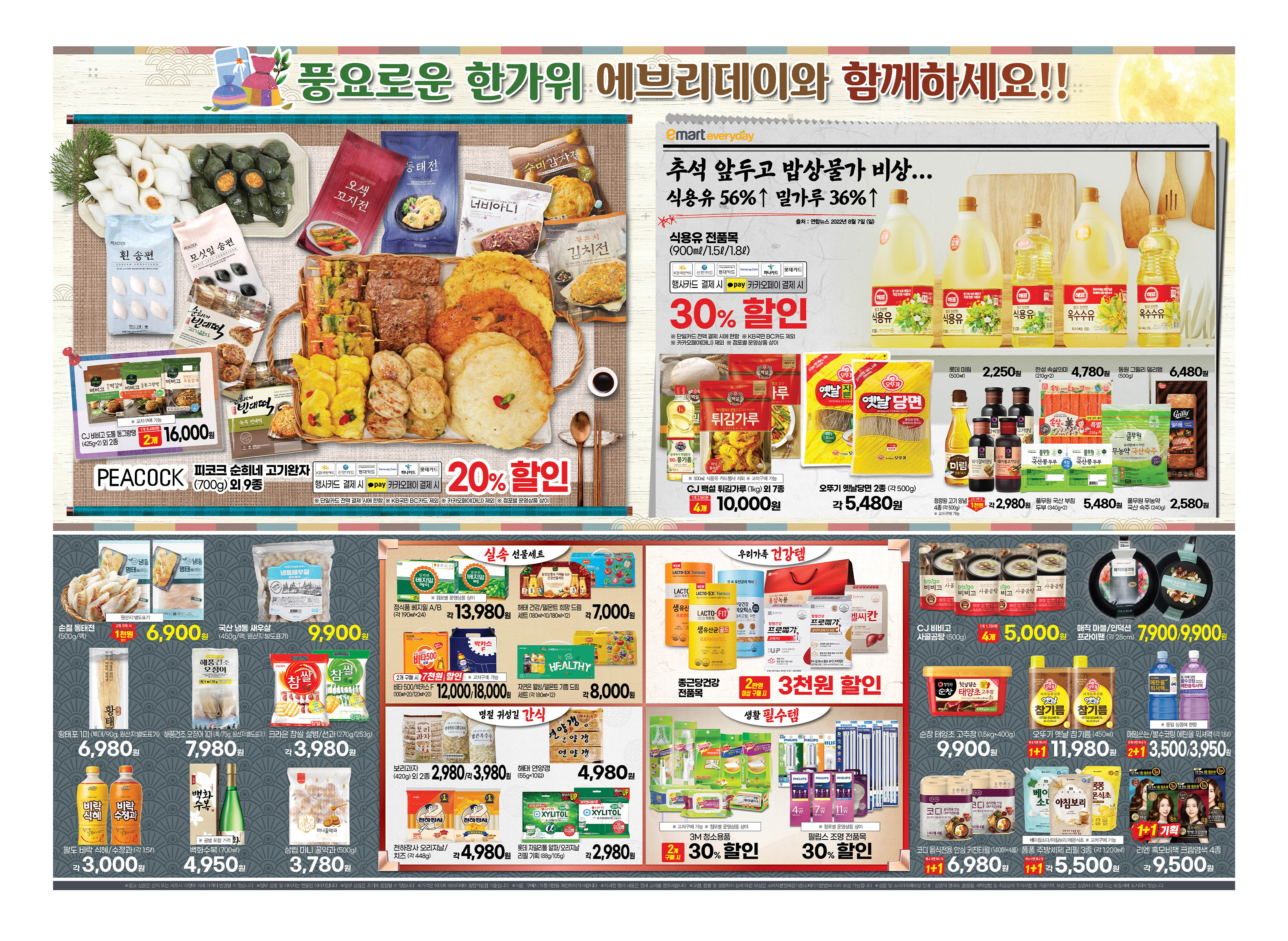 이마트 에브리데이 2022년 9월 2째주 전단행사 품목은 시금치, 대파, 고사리, 밤고구마, 제수용 사과 및 배, 곶감, 단감, 감귤, 거봉, 추석 선물세트, 제수용 음식, 식용유, 추석선물세트, 맥주, 커피, 과자, 음료수, 와인 등 대부분 상품들이 행사중입니다.