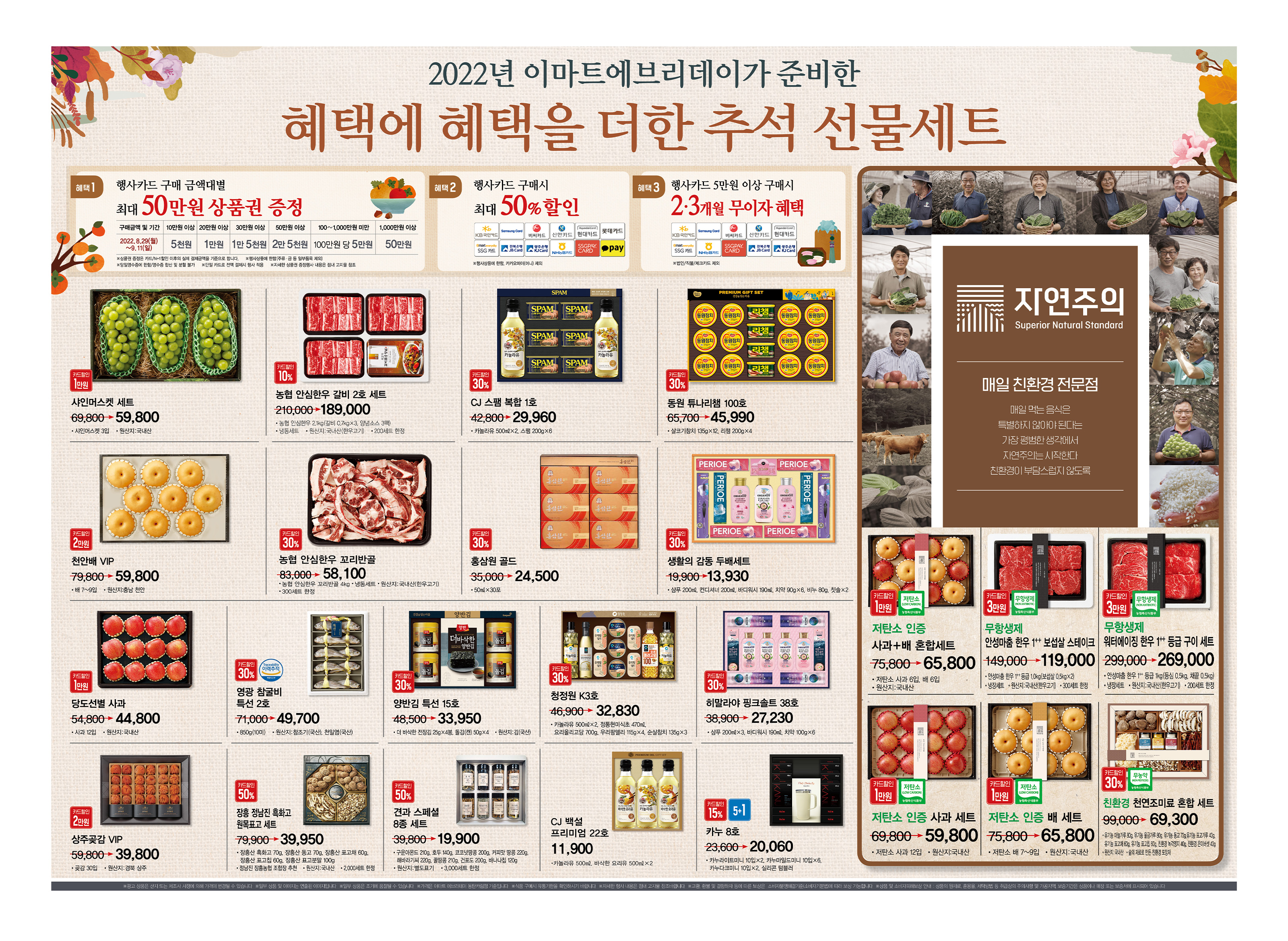 이마트 에브리데이 2022년 9월 2째주 전단행사 품목은 시금치, 대파, 고사리, 밤고구마, 제수용 사과 및 배, 곶감, 단감, 감귤, 거봉, 추석 선물세트, 제수용 음식, 식용유, 추석선물세트, 맥주, 커피, 과자, 음료수, 와인 등 대부분 상품들이 행사중입니다.