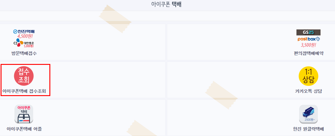 접수한 택배가 정상적으로 접수됬는지 확인을 원할 경우 '아이쿠폰택배 접수조회'를 클릭합니다.