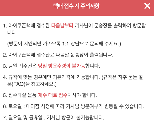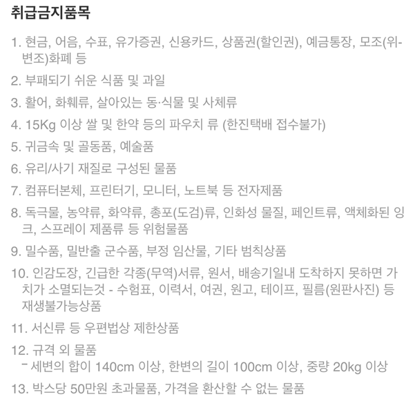 현금과 같은 유가증권, 부패되기 쉬운 제품, 무게가 많이 나가는 제품 등 접수가 안되는 품목들이 있으니 접수 전 미리 확인하시기 바랍니다.