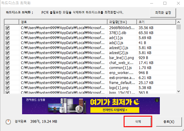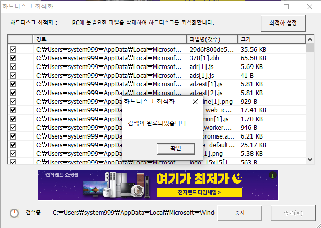 하드디스크 최적화 버튼을 누르면 자동으로 불필요한 파일검색이 시작됩니다.