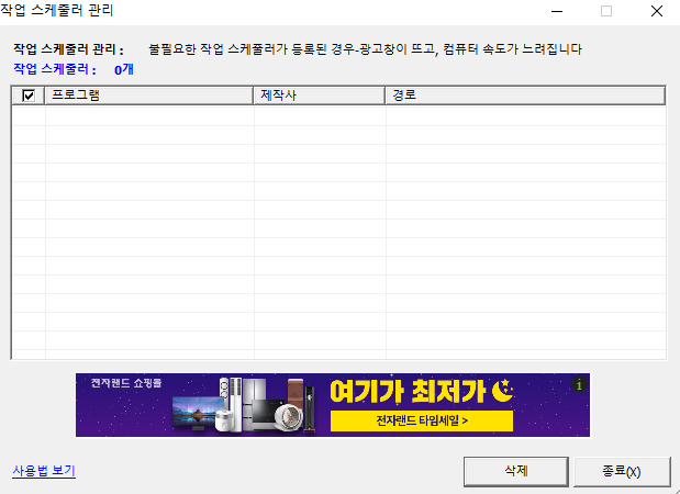 불필요한 스케쥴러가 있을 경우 광고창이 노출되고, 컴퓨터 속도는 느려집니다.
