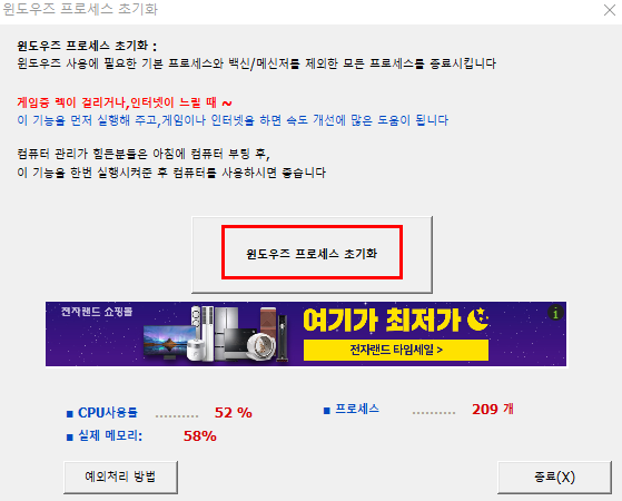 윈도우즈 프로세스 초기화를 누르시면 프로세스가 초기화됩니다.