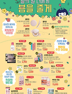반응형 뷰티행사1 2017년 3월 왓슨스 이벤트 지하철이나 번화가중심에 있는 전문 헬스&뷰티 스토어인 왓슨스의 3월 행사에 대해서 알아보도록 하겠습니다. 특정제품 1+1행사부터 전문브랜드 20~50% 세일행사, 영화이벤트 예매권 증정 행사 등 다양하게 구성되어 있습니다. 항시 진행되는 이벤트가 아니다보니 이벤트기간에 맞춰서 원하는 상품을 구매한다면 더욱 알뜰쇼핑에 도움이 될 것 같습니다. 1. '활짝 필 너에게 봄을 줄게' 대부분 여성 화장품 위주로 구성되어 있습니다. 1+1제품부터 멤버쉽 23~50% 할인과 기획세트 등 있습니다. 추가로 한정수량있는 제품도 있으니, 한정된 상품은 빨리 구입하시는게 좋을 것 같습니다. 이벤트기간은 2017년 2월 25일 ~ 3월 31일 이므로, 아직 시간적 여유가 있으니 고민하시고 구매해도 좋을 것 같습니다. 2. '.. 2017. 3. 6. 이전 1 다음 반응형